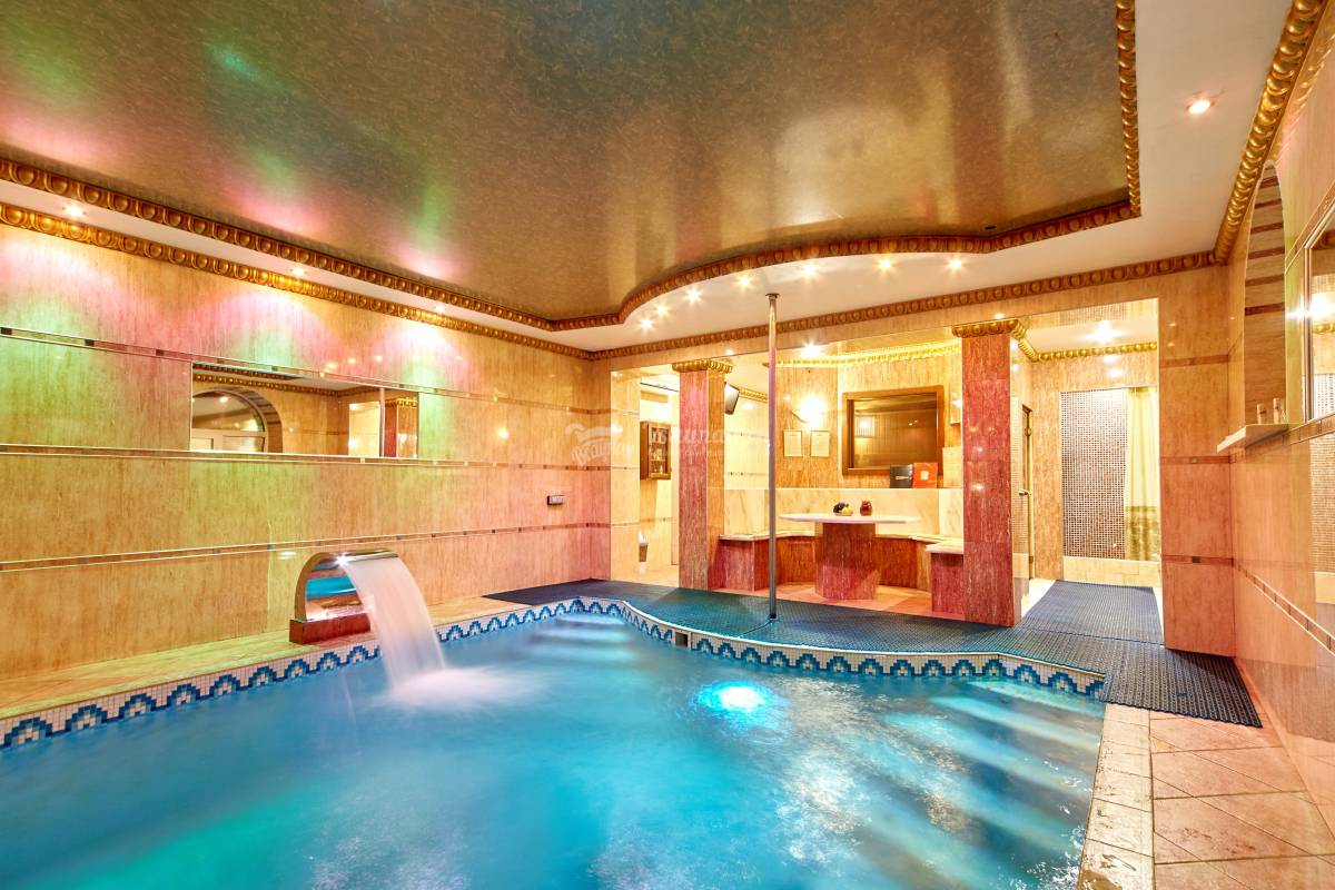 - Бассейн и купель с температурными режимами регламентируемыми нормами СанПин. В бассейне работают: гейзер, водопад и искусственная волна. Для развлечения детей имеются надувные игрушки.